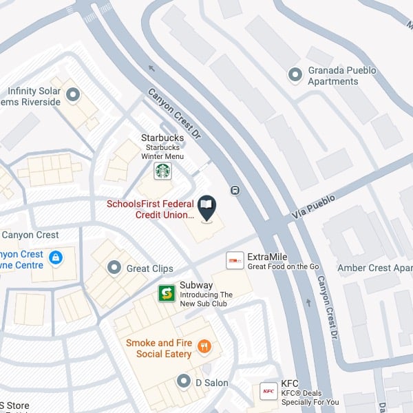This branch is located at Canyon Crest Towne Centre near the intersection of Canyon Crest Dr and Central Ave.