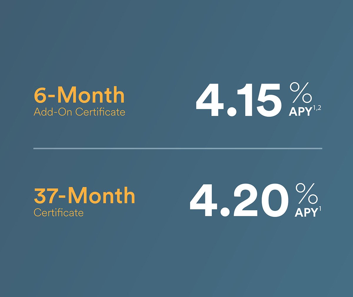 No matter your financial goals, we can help get you there faster with a promotional share certificate. Enjoy more savings and flexibility with two rates and terms to choose from — because you can never have too much of a good thing.